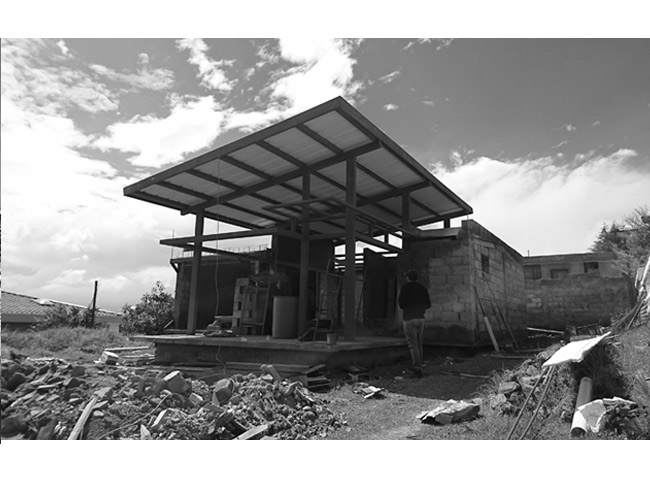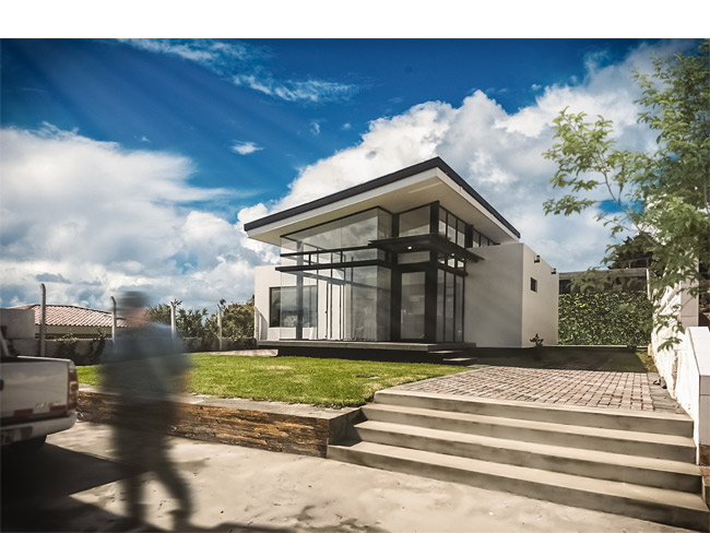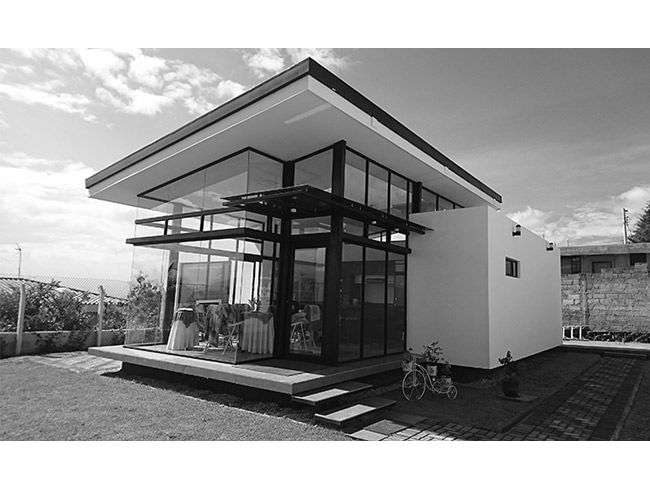 Ubicada en Conocoto Sur – Este de Quito, con 120 m2 es un diseño de estructura ligera elevada del suelo natural. El área social se desarrolla en una caja de aluminio y un vidrio.